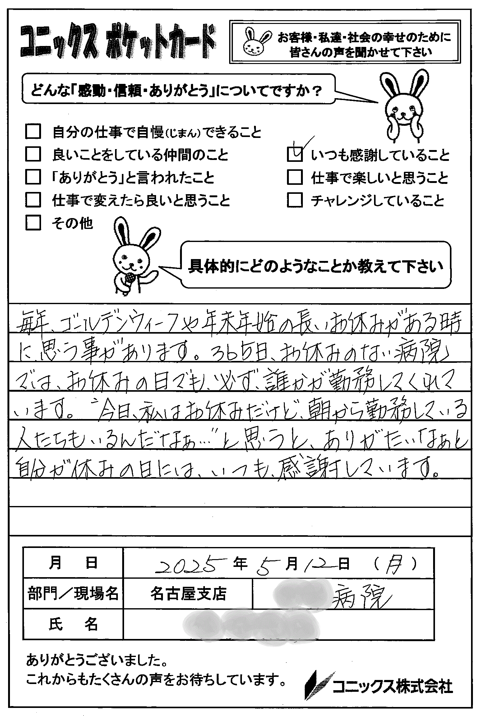 仲間に限らず、コンビニ・スーパーなど世の中には自分がお休みの日や寝ている時間に働いてくださる方々がいます。