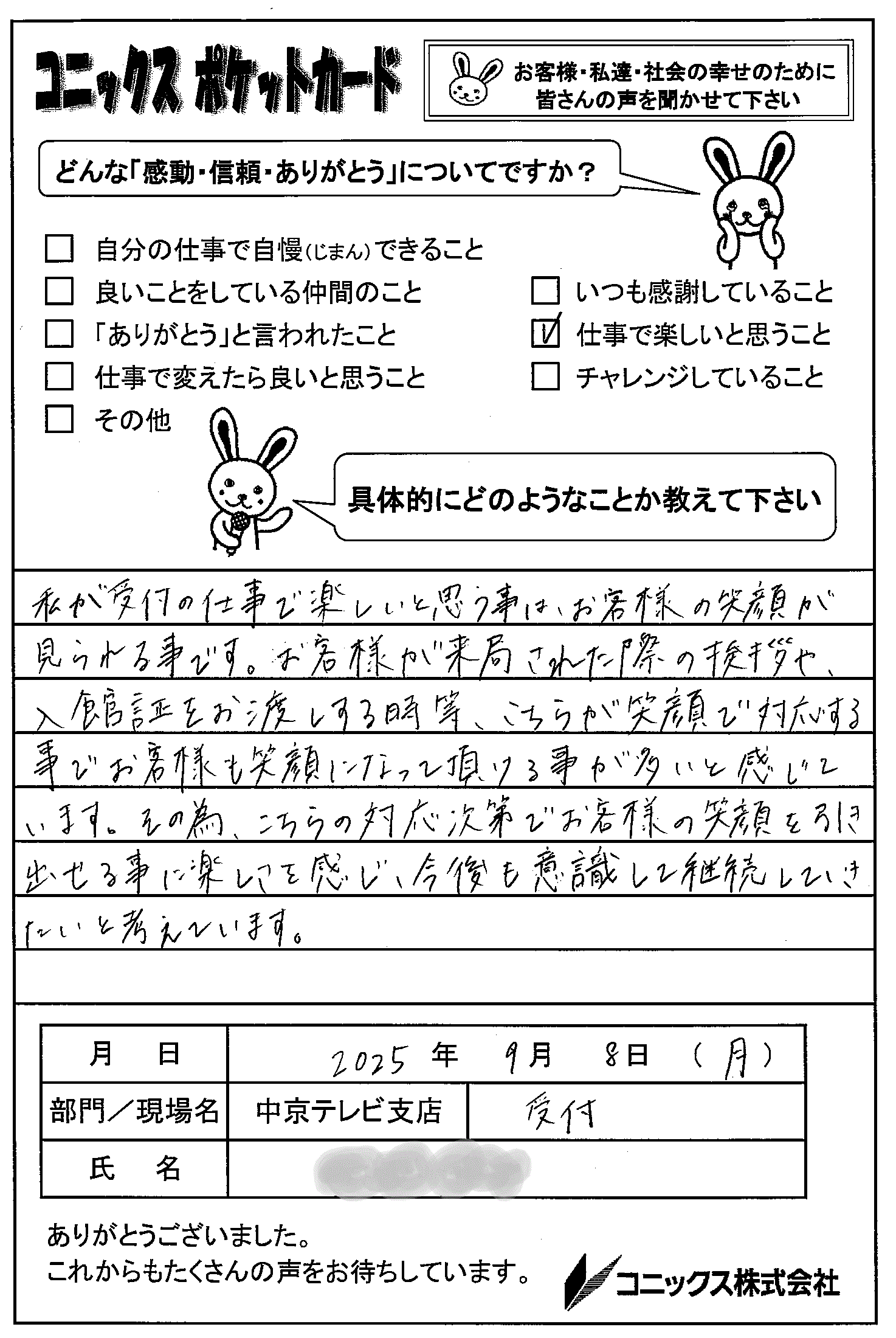 お客様の笑顔を大切にして、自分の対応で相手の気持ちが明るくなることに喜びを感じられるとは、感受性が豊かでカッコいい仕事ぶり&心掛けですね。