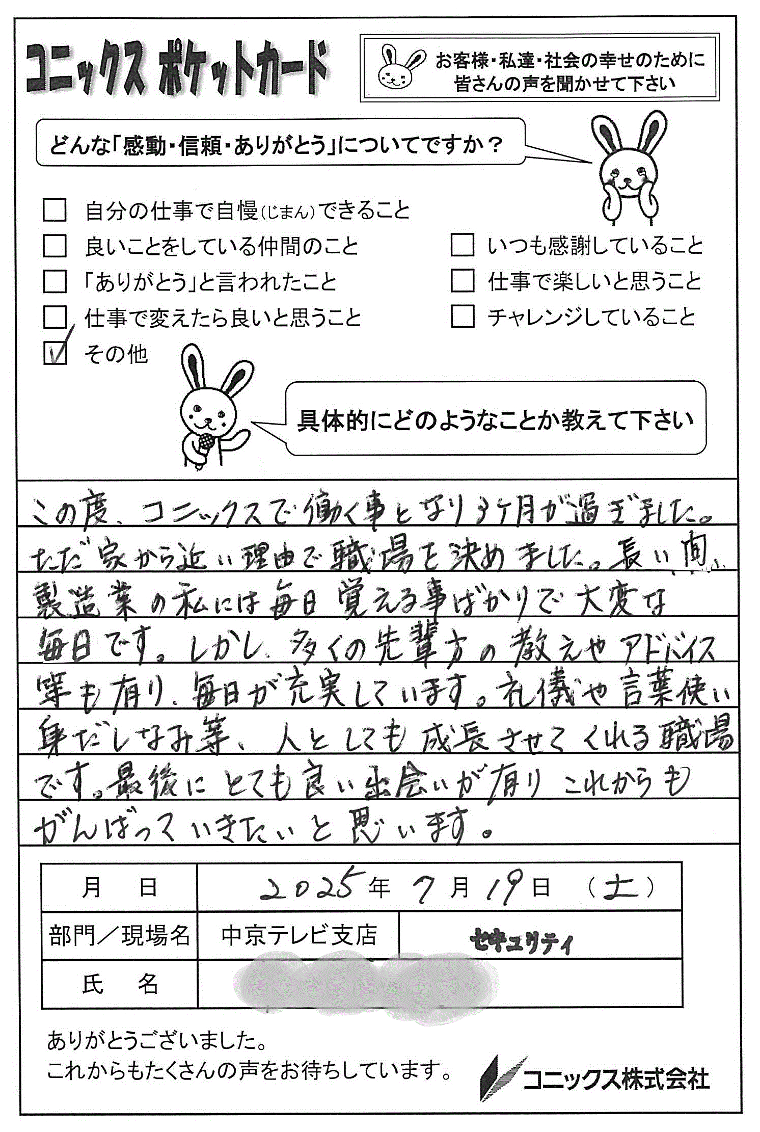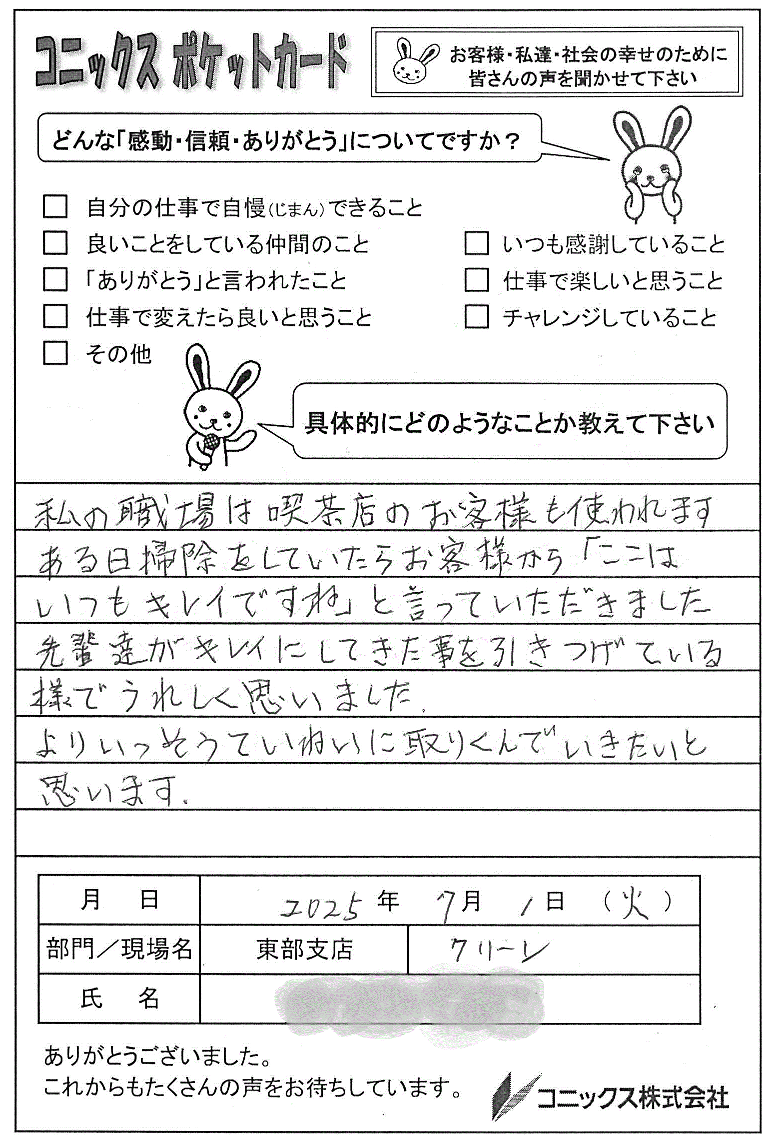 「いつもキレイですね」 と褒められたことを、自分の努力だけではなく、先輩方の努力にも感謝できる謙虚さと、前向きな意志と向上心が込められたポケットカードを読んで、私も背筋が伸びるような気持になりました。