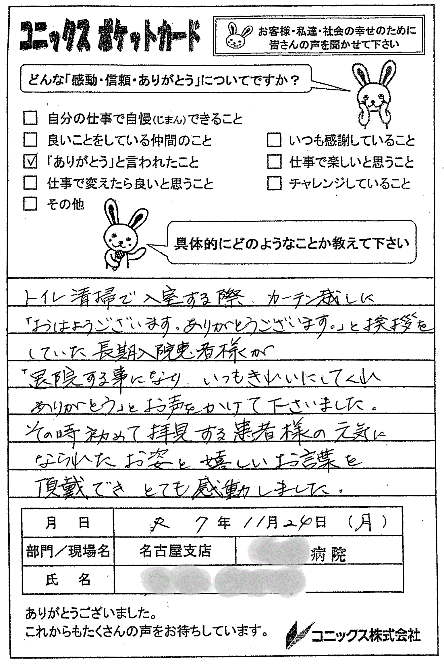 トイレ清掃のたび、元気に挨拶をし続けたからこそ、退院される長期入院の患者様から感謝のお言葉をいただけたのですね。