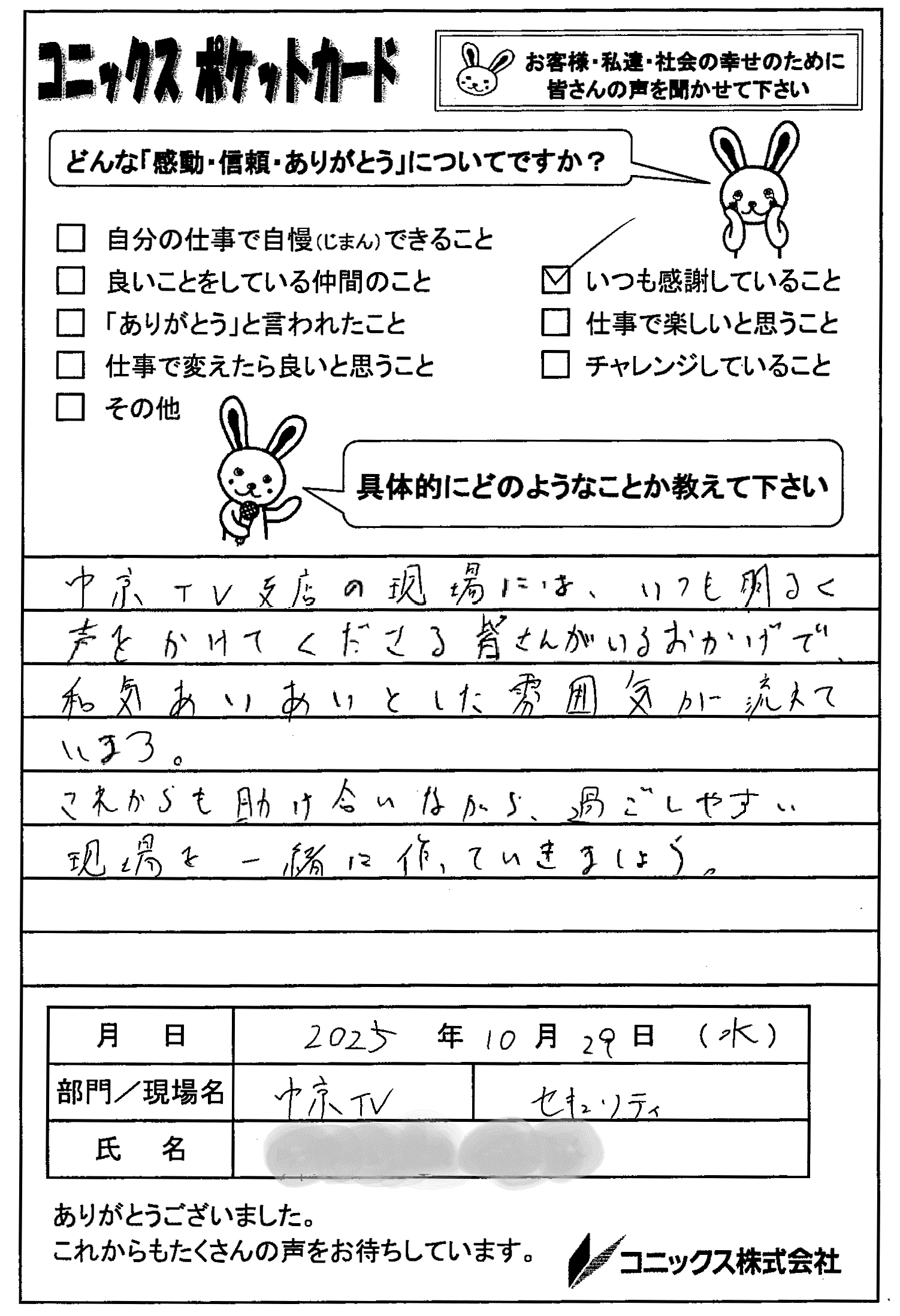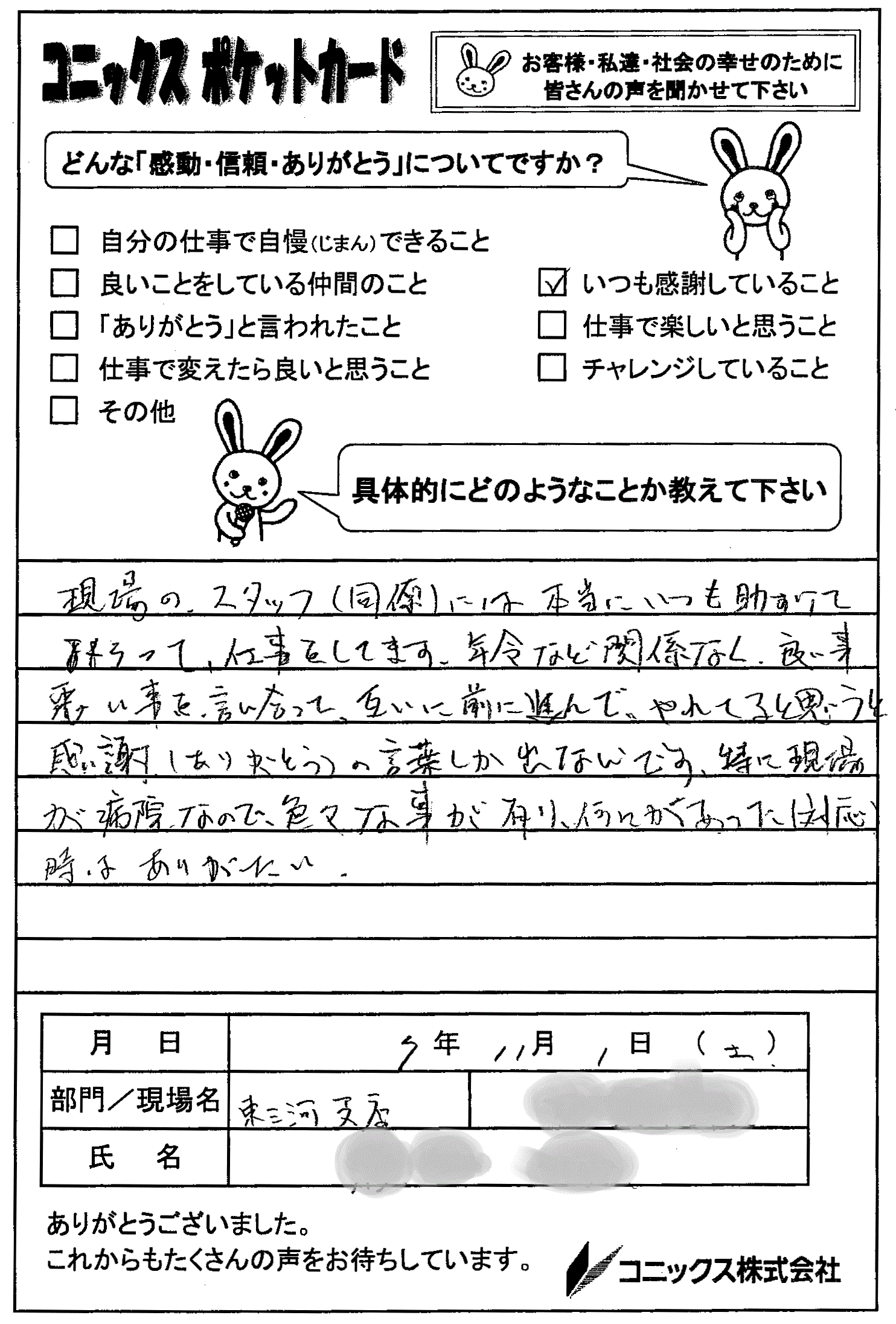 周りへの感謝と、これからも一緒に良い職場をつくろうという前向きさが伝わる、読んでいて温かい気持ちになるポケットカードをありがとうございます!