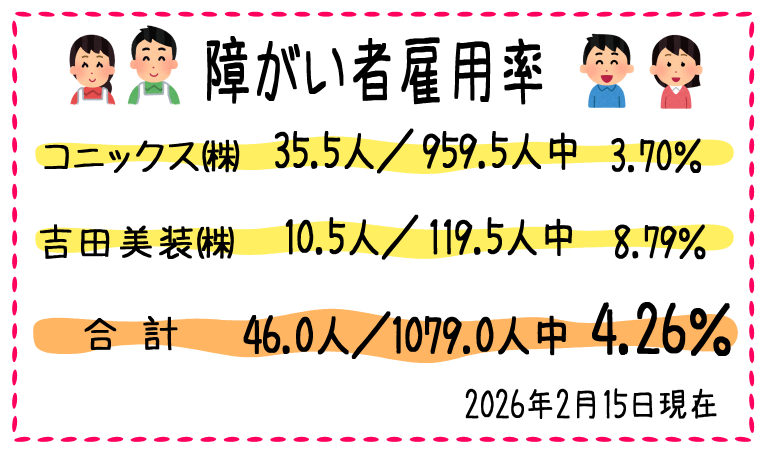 コニックスグループでは、障がい者雇用率3.3%以上を目標に進めております。