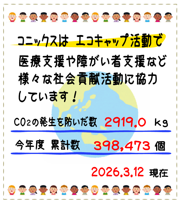 コニックスグループでは、エコキャップ運動へ参画しており、2025年度の全社目標は40万個に向け、従業員全員でキャップを集めております。